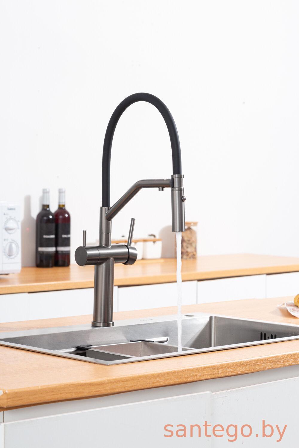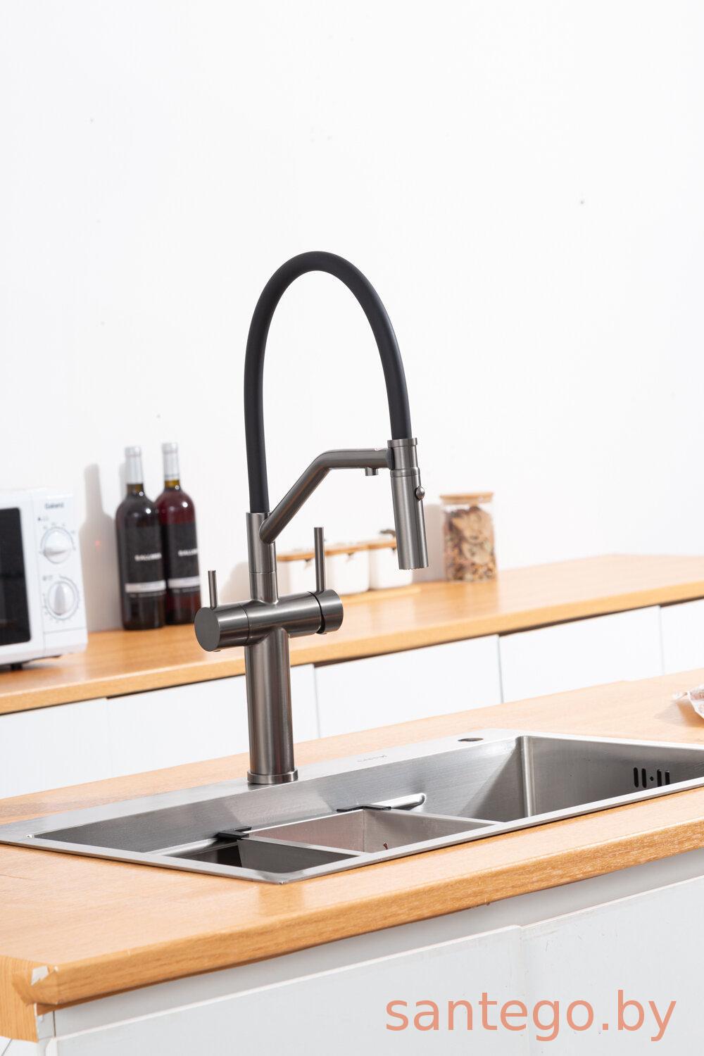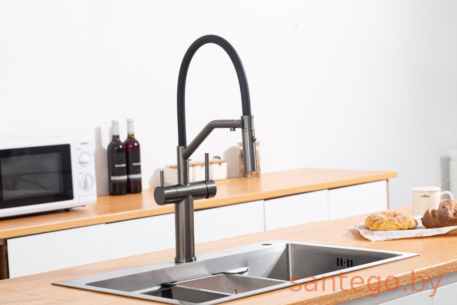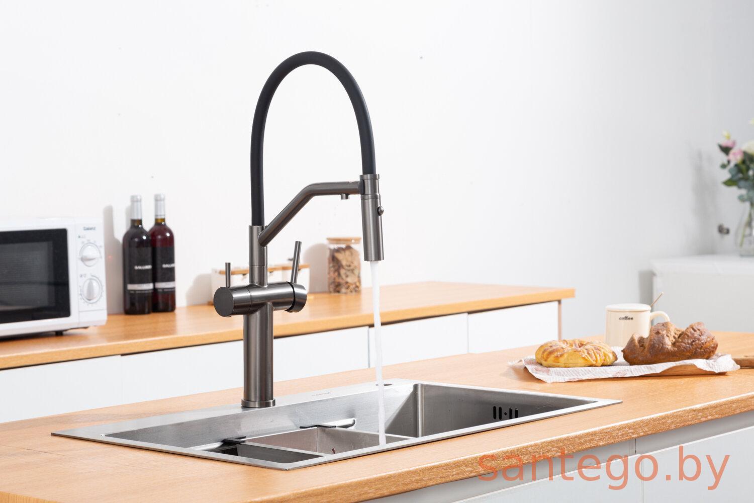 Смеситель для кухонной мойки Gappo G4399-89 с гибким изливом и подключением фильтра питьевой воды, оружейная сталь