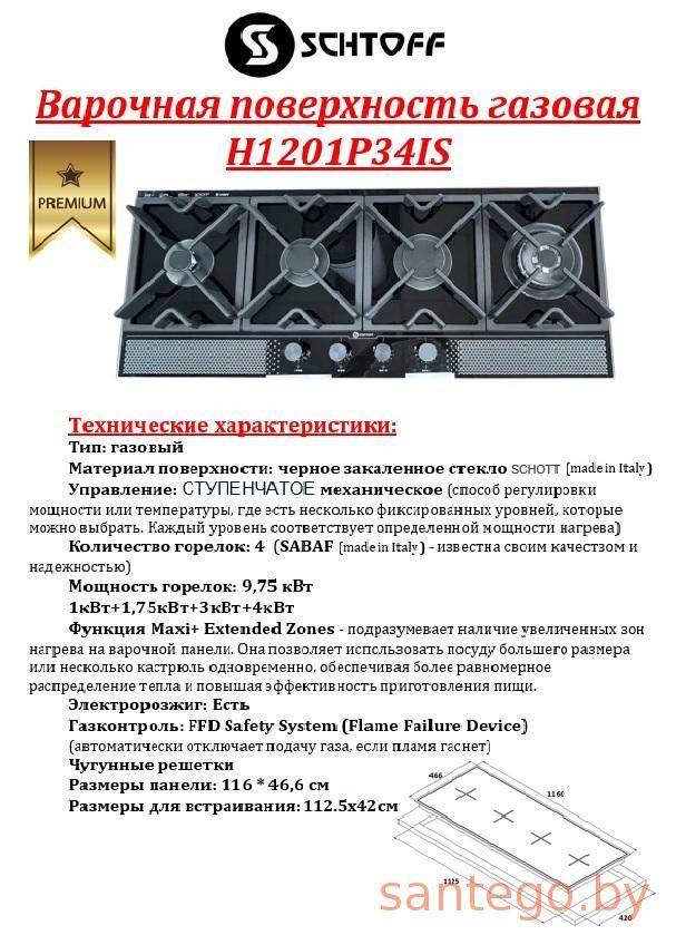 Газовая панель SCHTOFF H1201P34IS обеспечивает мгновенный нагрев и точную регулировку температуры, что позволяет готовить блюда с максимальным комфортом и легкостью. Эта газовая панель подходит для всех типов посуды, включая кастрюли и сковороды различных форм и размеров, что делает её универсальным решением для любой кухни. Современная технология безопасности (газ-контроль) гарантируют надежную работу, предотвращая утечку газа. Стильный и элегантный дизайн панели гармонично впишется в любой интерьер, а благодаря простоте в использовании и легкости в уходе, можно сосредоточиться на процессе приготовления пищи. Не упустите шанс сделать Вашу кухню более функциональной и стильной! Выберите газовую панель H1201P34IS уже сегодня! Тип установки независимая Тип варочной поверхности газовая Газовые конфорки WOK нет Управление механическое Цвет черный Газовые конфорки SABAF 4 Материал рабочей поверхности закаленное стекло SCHOTT Трёхуровневая конфорка есть Общая мощность 9,75 кВт 1-ая конфорка 1 кВт 2-ая конфорка 1,75 кВт 3-ая конфорка 3 кВт 4-ая конфорка 4 кВт Электроподжиг есть Газ-контроль есть Решетки раздельные чугун Ширина 116 см Глубина 46,6 см Размеры для встраивания варочной поверхности Ширина 112,5 см Глубина 42 см